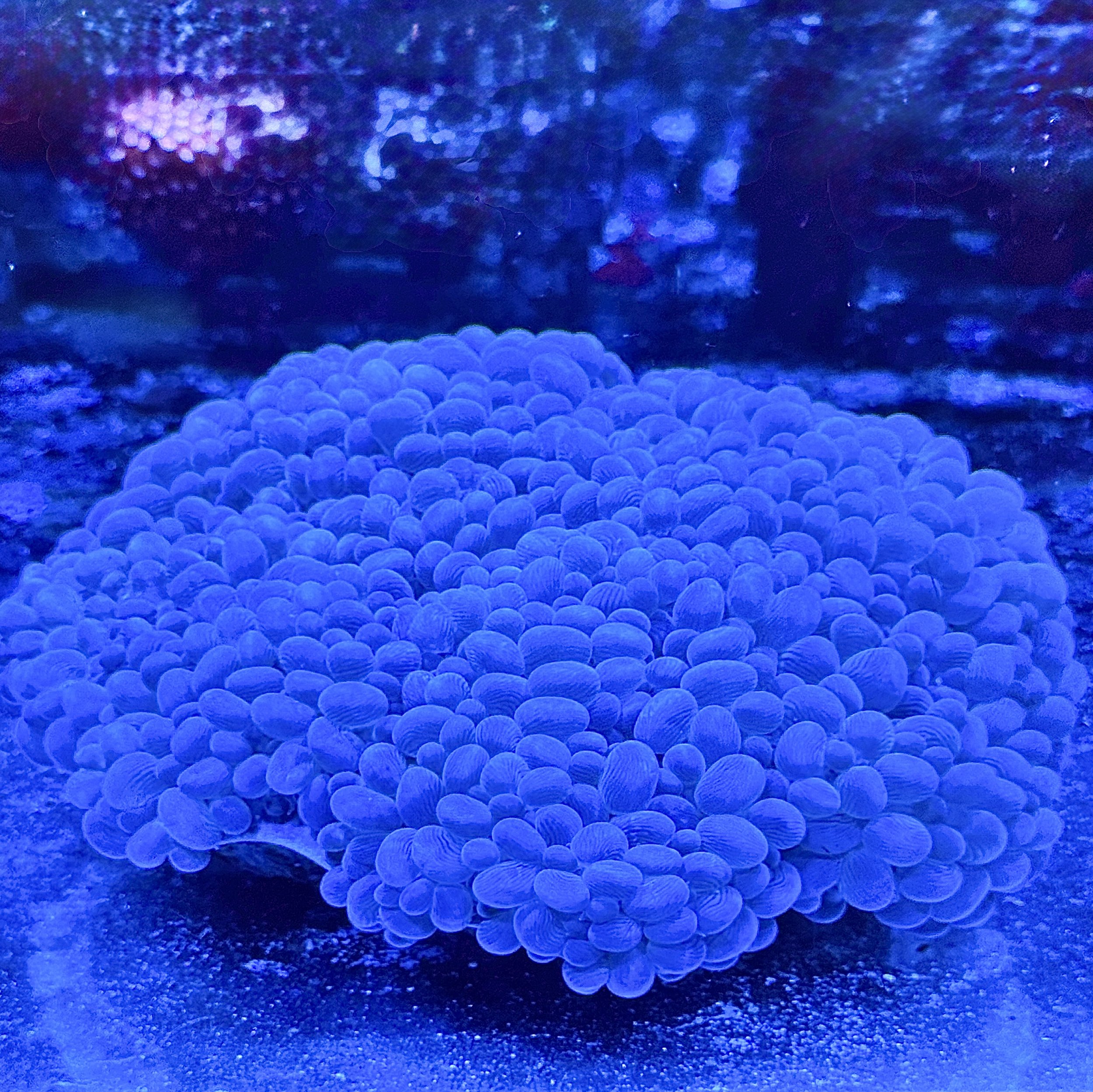 The Bubble Cat Eye is a stunning aquacultured morph of Plerogyra sinuosa, celebrated for its distinctive glowing “cat-eye” centers embedded within each translucent bubble. This coral displays large, water-filled vesicles that shimmer in soft shades of jade green, mint, and icy teal, each bubble exhibiting a bright, elliptical “eye” pattern that glows intensely under actinic or blue LED lighting.
