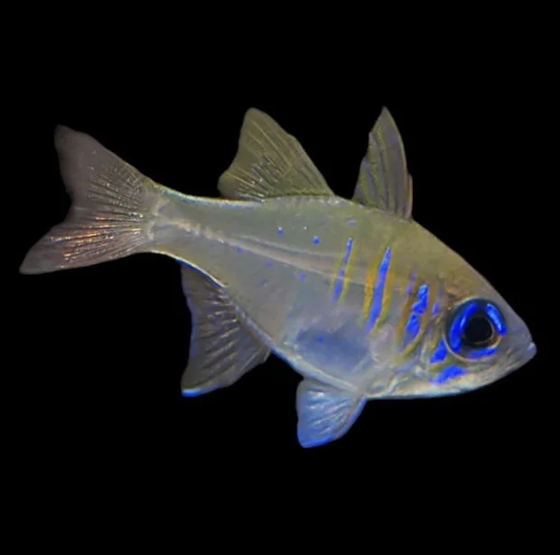 The Pajama Cardinalfish is a rainbow of playful colors. It has a greenish-yellow face, bright orange eyes, and a silver-based body dressed with a bold black scalar margin and a posterior dotted with orange polka-dots. Though its bold coloration may stand out, Sphaeramia nematoptera has a peaceful nature that lets it blend perfectly into any community saltwater aquarium.