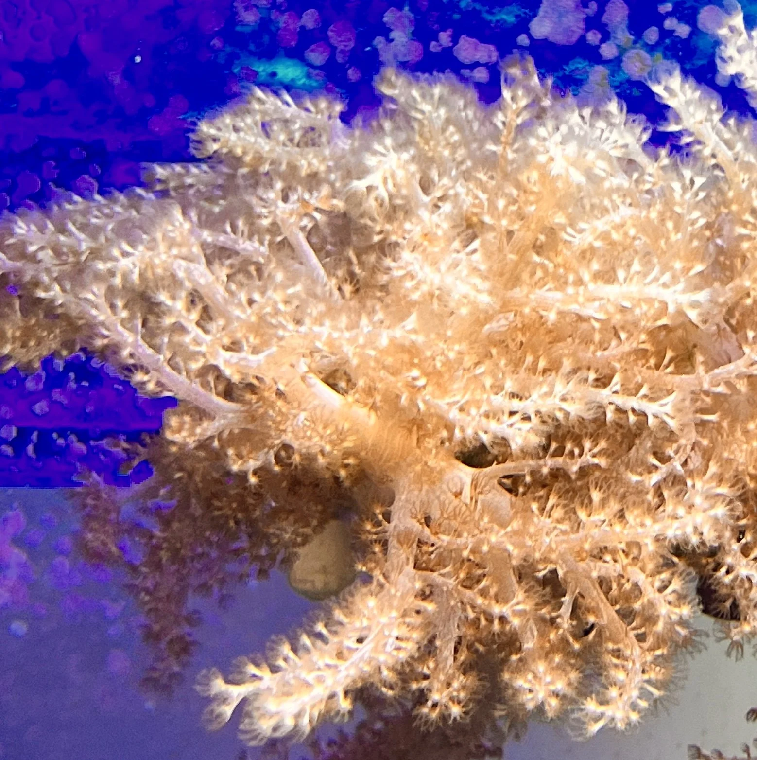 These corals come in many forms and personalities. Some, like Pulsing Xenia, have polyps that open and close rhythmically, creating a mesmerizing pulsing effect without any external help. Others, like Clove Polyps, grow into star-shaped mats that wave gently, while Leather Corals often take on mushroom, toadstool, or cabbage-like shapes, adding structure and movement at the same time. Green Star Polyps (GSP) are famous for growing over rocks and back walls, forming vibrant green carpets that shimmer under blue light.